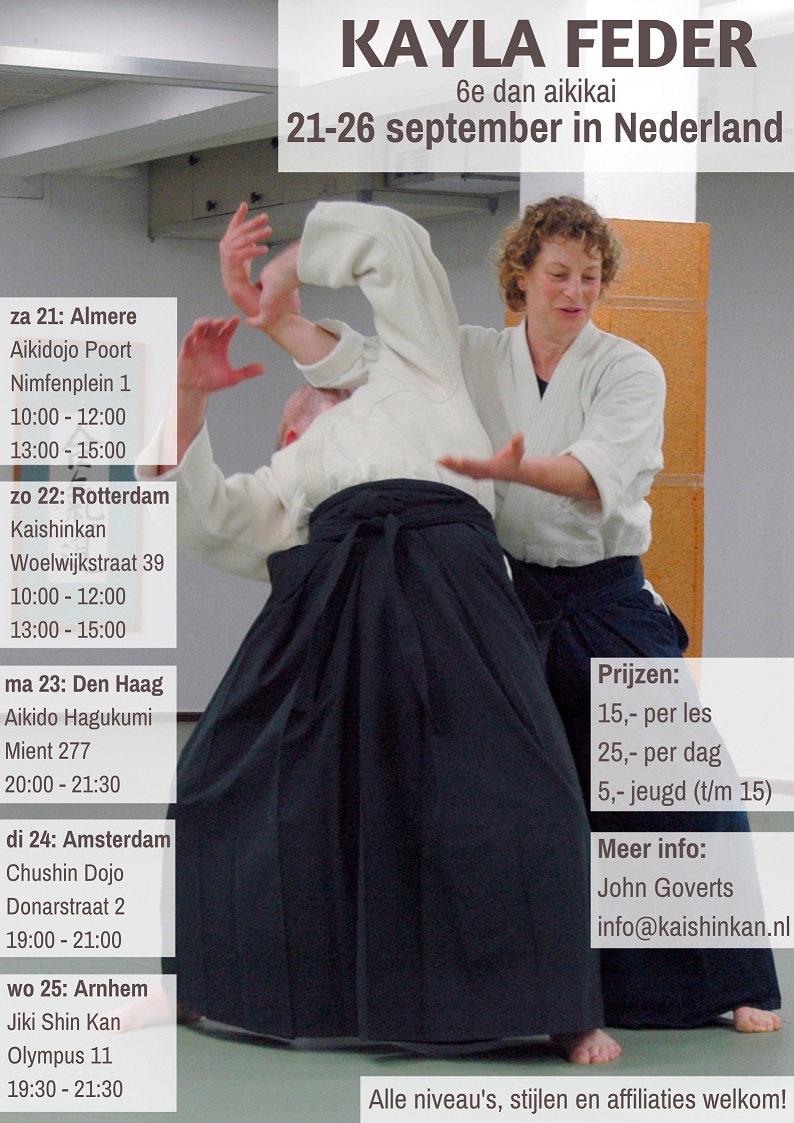 Kaishinkan Dojo Rotterdam en Aikidojo Poort Almere (http://aikidojopoort.nl/) organiseren samen een stageweekend met Kayla Feder Sensei, Aikido of Berkeley, California (http://aikidoofberkeley.com/). De stage vindt plaats op zaterdag 21 september in Almere en zondag 22 september in Rotterdam. Aansluitend zal Kayla Feder Sensei op dagen daarna een aantal dojo’s bezoeken.